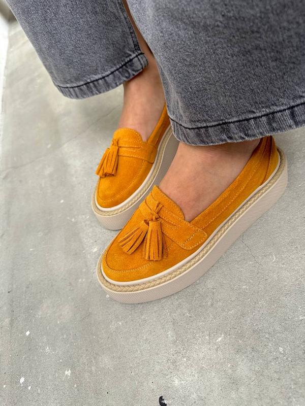 Лофери Матеріал: натуральна замша Матеріал підкладки: натуральна шкіра + латексна устілка з сіткою (виймається) Підошва – поліуретан Висота підошви 3/4 см Розмірний ряд 36-41 Колір гірчичний