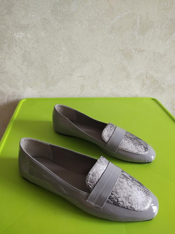 Легкі сірі лакові мокасини, балетки, лофери Матеріал: еко-шкіра. Довжина устилки: 26 см. Ширина устілки 8 см Дивіться на фото. Стан: нові. Є нюанс: всередині на одному є маленька подряпина., зачіпка 111к