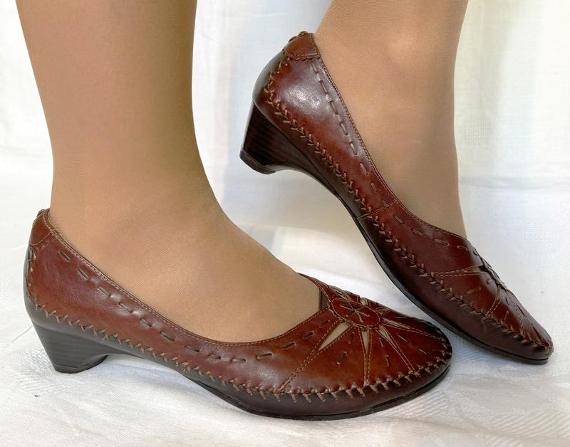 587. Зручні м´якенькі туфлі-мокасини на маленьких підборах відомого німецького бренду "Jana" в ідеальному стані без дефектів: чисті устілки без "відбитків", без сторонніх запахів, рідні набійки без зносу - може, єдиний раз взуті Модель у стилі взуття "Pikolinos" (Португалія) Jana — німецький бренд, відмінними рисами якого є увага до моди та здоров´я. Лінія Jana Natural представляє моделі, виконані із застосуванням ручної праці та екологічно чистих матеріалів: внутрішня шкіра видублена за допомогою натуральних екстрактів, текстильна підкладка виготовляється з органічно вирощеної бавовни. Колір комбінований - поєднання двох відтінків коричневого Матеріал верха - натуральна гладка шкіра, м'яка та еластична Декоровані крупною строчкою і вишивкою шкіряними шнурами Підкладка та устілка - також з натуральної шкіри, під устілкою шар м´якого пружного піноматеріалу Розмір вказано 6,5, йде на наш 40 р. Устілка - 26 см рівно, ширина устілки - 8,5 см Повнота Н – дуже комфортна, за таблицею повноти розраховані на обхват стопи в "кісточках" (міряти по колу) 23-24,7 см Каблук - 4 см, товщина підошви в носовій частині - 0,4 см Можу надати додаткові фото Дивіться інші мої оголошення Лояльні умови купівлі: можливий обмін, повернення (обговорюється до покупки), детальніше про умови в розділі "Про мене"