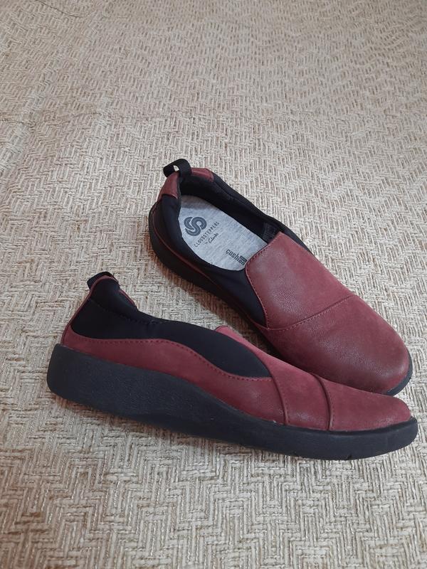Легенькі дуже зручні лофери ,туфлі мокасини сліпони бренду Clarks, з ергономічною устілкою Колір - марсала Модель продумана до дрібниць ,деталі чорного кольору - із еластичного трикотажу"Дайвінгу" який відводить вологу добре розтягується - що зручно при взуванні і в той же час він цупкий і тримає ніжку у комфорті Верх - екошкіра П'яточка плотно облягає і має петельку з репсової стрічки для зручності знімання мокасін Підошва надлегка ортопедична , повторює форму ступні Розмір 36 Довжина устілки 22,5 Ширина устілки 7.5