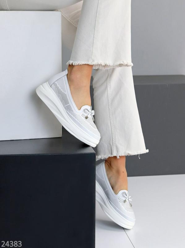 Популярные мокасины на девушку в белом цвете натуральная кожа с перфорацией на высокой пла...