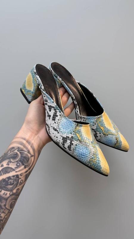 Мюлі з італійської шкіри під рептилію блакитні жовті на підборах