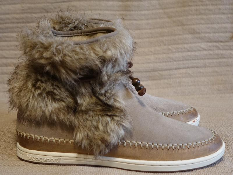 Французький бренд Le Coq Sportif бере свій початок далекого 1882 року. Тоді він зарекомендував себе як якісний виробник одягу з власним баченням і оригінальними дизайнерськими рішеннями. Зараз марка відома в усьому світі, а її логотип дізнаються й цінують не тільки в рідній країні, але й за її межами Еміль Камузі продовжив справу, якою робили його предки, і також привернув свого сина до трикотажної майстерні. Хлопчик досяг непоганих результатів у гімнастиці та футболі, за це йому запропонували зайняти одну з керівних посад у "Етуаль Спортив", де головним обов'язком було забезпечення членів клубу екіпіруванням і уніформою. Саме тоді сформувався напрям, у якому випускатиме надалі свої товари фірма Le Coq Sportif У той час у sport індустрії було багато виробників. Але всі вони використовували нееластичні матеріали, якіюча дискомфорт і сковувати рух. Еміль-молодший швидко знайшов інноваційне рішення і випустив вироби зі зручного трикотажу, який красиво облягав тіло та був гарантом безмежної свободи. Такі костюми 664 спортсменам феноменальна зручність, відкриваючи перед ними нові горизонти. Тому дуже швидко компанія стала офіційним постачальником форми для футбольних і баскетбольних команд, а також для легкоатлетів. Її масштаби вели далі: випущена в 1940-х колекція "Референс-40" була першою олімпійською формою Після Другої світової війни Ле Кок Спортиф розширили асортимент, спираючись на переваги шанувальників активного дозвілля. У продажу з'явилися футболки, поло та светри. Тепер вони були символом успішності й елегантності, адже дизайнери змогли подивитися за межі звичайного стилю. Фірмові речі завжди вирізняли зручний крій, креативний дизайн і цікаві комбінації кольорів. Всі модники з нетерпінням чекали випускування одягу в карту та в смужку. Вона і стала якоюсь родзинкою Камюзе-молодшого. Тому французький бренд усім асоціюється з нею і зі своїм незвичайним логотипом. У перекладі назва торгової марки означає "спортивний півень". Він гордо красується на бирці вже понад сотні років. За цей час додали кілька деталей, але символ залишався незмінним Продаються гарні комбіновані шкіряні напівчоботи культового французького спортивного мультибренда Le Coq Sportif. Традиційно це модель спортивного взуття. Верх виробу виготовлений із комбінованих видів натуральної шкіри. По нижньому краю проходить шар м'якої натуральної шкіри тютюнового кольору, вище — м'яка натуральна замша сірувато-бежевого кольору. Два шари натуральної шкіри з'єднуються об'ємним декоративним швом, виготовленим товстими шовковистими нитками золотисто-бежевого кольору. По верхньому краю виробу проходить облямівка м'якого штучного хутра меланжевого бежевого кольору (під хутро вовка). Хутряна вставка у взутті фігурна: спереду вона коротша, ззаду довша, а найдовша — на бічних поверхнях. Ззаду до рівня хутряної вставки міститься глибокий розріз, на вільних краях обшитий м'якою натуральною замшею сірувато-бежевого кольору. У верхній частині хутряного задника пришиті з одного боку великий дерев'яний ґудзик із зображенням назви бренда ( назва бренда зображено тисненням по шкірі в нижній частині задника та на гумовій підошві), а на протилежному боці нашита трикутна замшева вставка, на якій зображений логотип бренда. Під цією трикутною замшевою вставкою вшитий закільцьований шкіряний