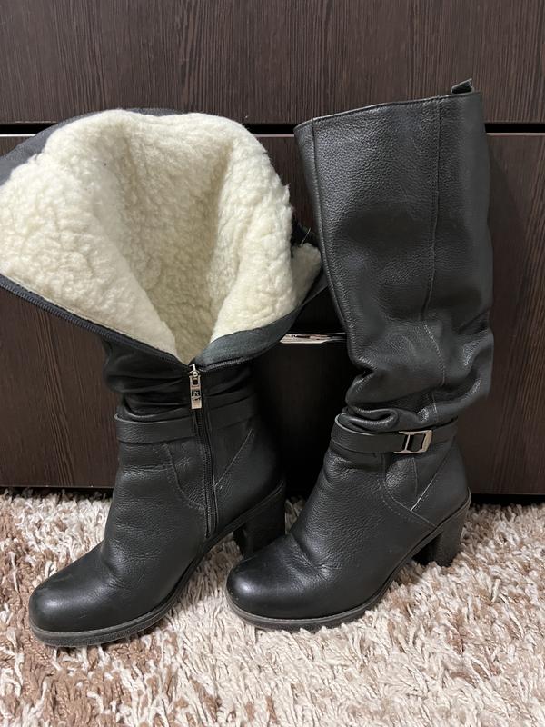 Шкіряні високі чоботи, утеплені овчинкою всередині. Розмір 37 (23,5 по устілці). Зручний каблук 7 см. Застібаються на блискавку по всій висоті. Є ледь видима затертість носочків Висота від підлоги - 41 см Ширина голені - 19 см