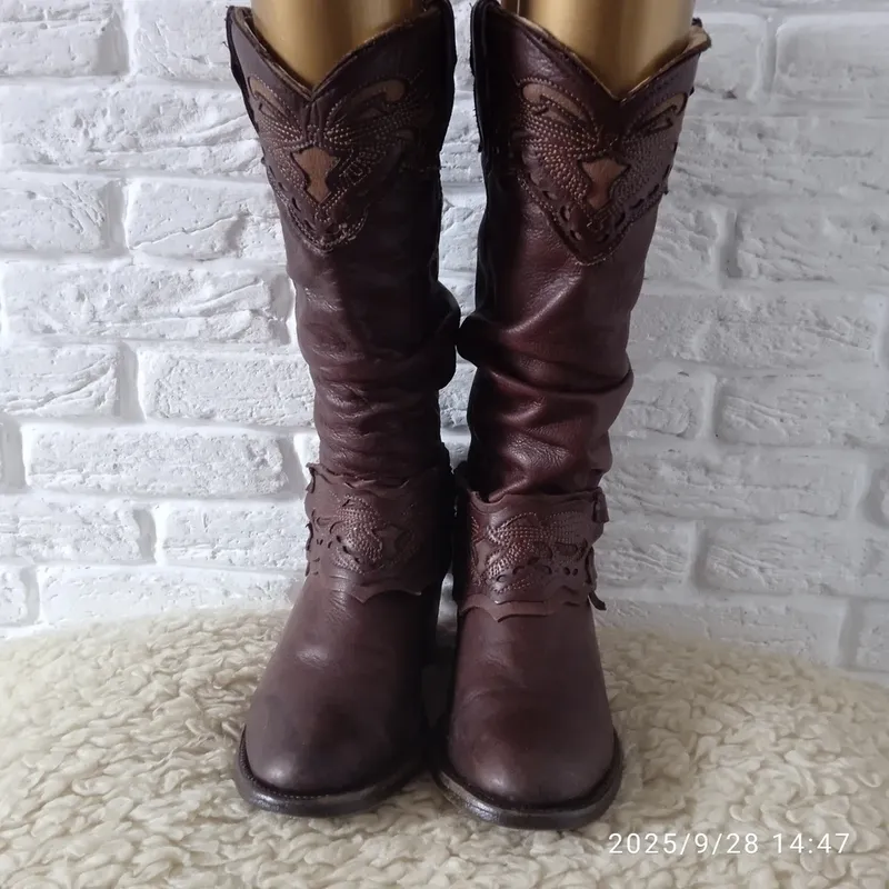 Гарні жіночі коричневі шкіряні чоботи USL 6.5 MEX 23.5 каблук 6 см висота 35 см устілка 24 см