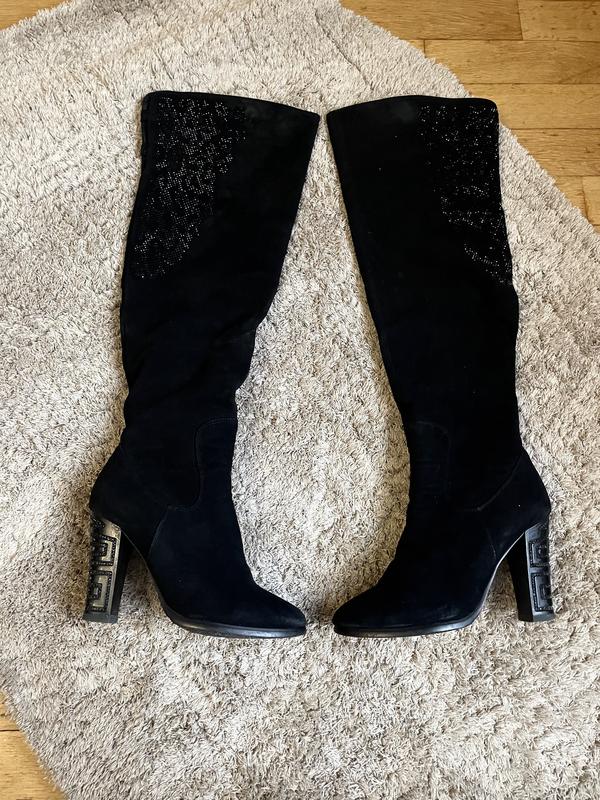Скоріш за все натуральна замша Бо віддали забезпечені родичі ,у них дороге взуття Розмір 37 Довжина до каблука 48 Каблук 10 Верх 21 Щиколотка 13 Устілка 24-24,5