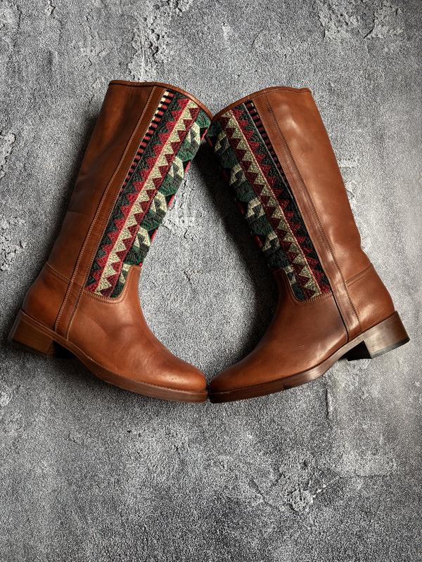 Високі чоботи Etro з барвистою етнічною вишивкою — справжній витвір мистецтва італійських майстрів. Особливості: • М'яка натуральна шкіра коричневого кольору • Яскрава вишивка з етнічними візерунками • Класичний силует у стилі для верхової їзди • Низький підбор для комфортної ходьби • Виробництво: Італія Характеристики: • Розмір: 39 розмір устілки (25-25.5) • Стан: чудовий • Матеріал: натуральна шкіра • Бренд: Etro • Колір: коричневий Ці чоботи поєднують традиційну італійську якість з унікальним дизайном, створюючи неповторний образ для справжніх цінувальниць стилю.