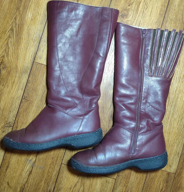 Натуральна м'якенька шкіра, утеплені натуральною овчиною, кольор бордо, винний насичений,є декоративні вставки з резинкою для розтягування литки,44 см можно ще +3-4 см, на повненьку литку буде,на 48см в литке буде ідеально, довжина устілки -24.5 см,втсота-39 см,на середню і ширшу ніжку,стан ідеальний, ньансів не має, дуже теплі і зручні в носінні,не секонд, вітчизняного часу,якість супер,такіх зараз не роблять,подошва лита,не сковзить