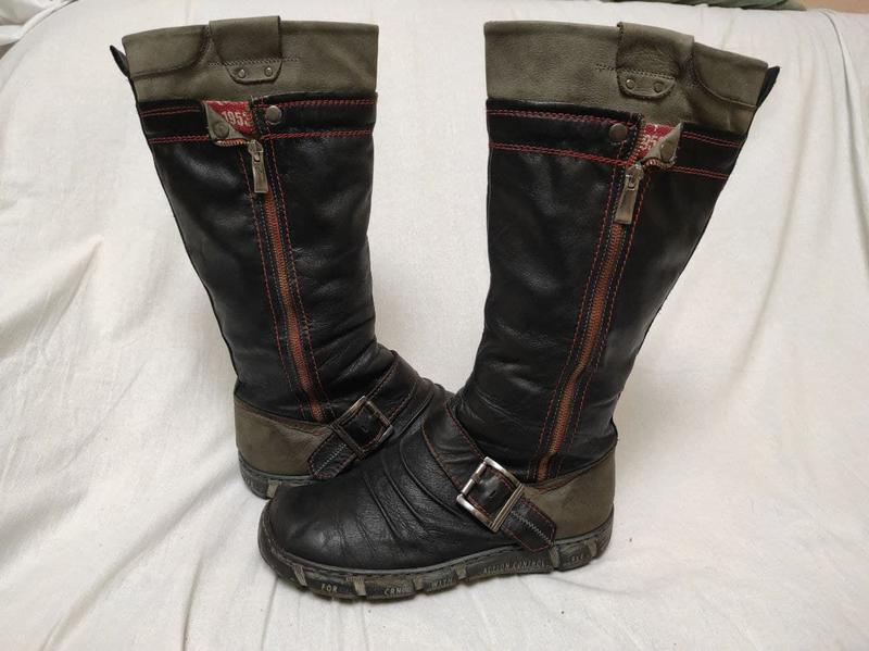 Сапоги кожаные бренда Carinii, р. 40 По стельке 25,6-25,8 см, внутри на меху, прошиты, высота с платформой 37 см. Застегиваются сбоку на молнию, с другого бока есть тоже рабочая молния (можно регулировать обхват голени), ПО по верху 18,5см Цыетовая гамма: черно - серо -красная. Кожа мягкая, качественная.