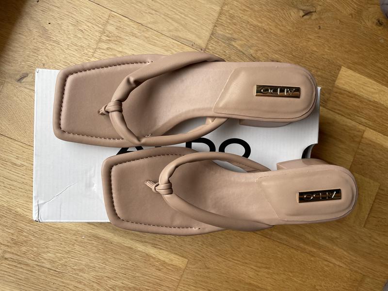 Дуже круті шльопанці від ALDO. Оригінал з Америки. Нереально гарного кольору, на вузеньку ніжку Виробник пише розмір 40, але по устілці 25 см. Ширина по стопі 9 см в найширшому місці, 7,5 см - по пальчикам. Висота каблука 3см. Абсолютно нові. Не підійшов розмір