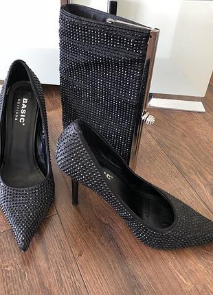 Продам туфлі турецької фірми Basic; в каменях Swarowski; висота каблука 10 см; фабрична профілактика на підошві; клатч в комплекті, розміри 14 на 24 см; стан як нові
