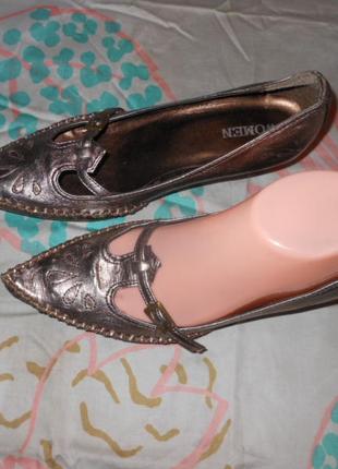 гарні якісні і нарядні босоніжки, туфлі на маленькому і зручному підборах. Гарного не ординарного бронзового кольору. Виглядають дуже стильно і модно! Дуже гарно сидять на нозі, підійдуть як під брюки, так і під спідницю! Дуже зручні, нога в них буде просто відпочивати! Розмір - 37 Устілка - 24 см Каблук - 4 см Балетки б/у, але стан добрий хіба що набійки на підборах змінити, але можна носити і так Ціна символічна!