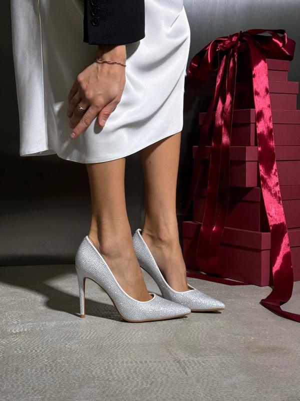 Білі неймовірні туфлі декоровані сяючими камінцями з гострим носом на підборах