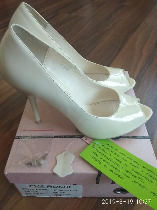 Ошатні (весільні) туфлі зі штучної шкіри на високому каблуці (10см). Туфлі мають округлений відкритий ніс і глянсову зовнішню обробку. Всередині натуральна шкіра. Розмір 37 (маломерят). В ідеалі на ніжку 23,5-24см. Колір беж. В комплекті є нові набійки. В хорошому стані. Одягалися 1 раз. Є дуже маленькі потертості (фото 3,4,5). Можливий невеликий торг. Без повернення і обміну.