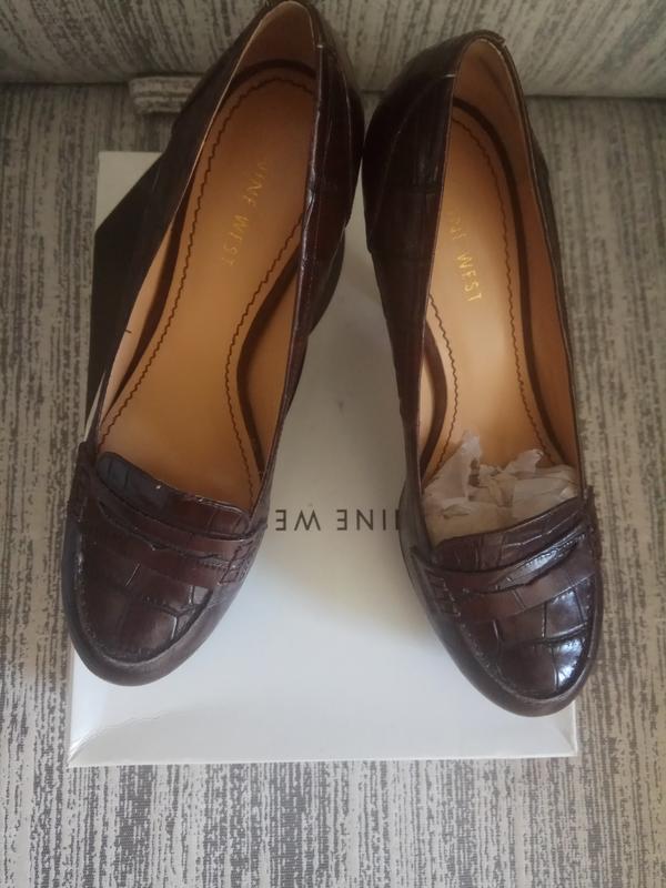 Туфли на каблуке-шпильке, в состоянии новых - обуты несколько раз (это видно по фото и состоянию подошвы, носов и набойки - она фабричная), тёмно-коричневые, кожаные, с тиснением под рептилию. Отличный вариант офисной обуви, неоклассика. Носы туфель выполнены в стиле мокасин. Бренд Nine West. Высота самой подошвы под пальцами - 2,8 см, высота шпильки - 11,5 см. Пара изготовлена в Китае, стопа ближе к узкой - ширина стельки под пальцами до 8 см. Размер производителя - 7 М, следовательно на наш размер нужно ориентироваться 37 - на последнем фото длина стельки по крайним точкам - 24 см. В зависимости от ширины стопы к основному размеру +- 0,5 размера, т.е. диапазон от 36,5 до 37,5. Никаких нюансов и дефектов. Упаковка производителя. На любые вопросы отвечу в переписке.