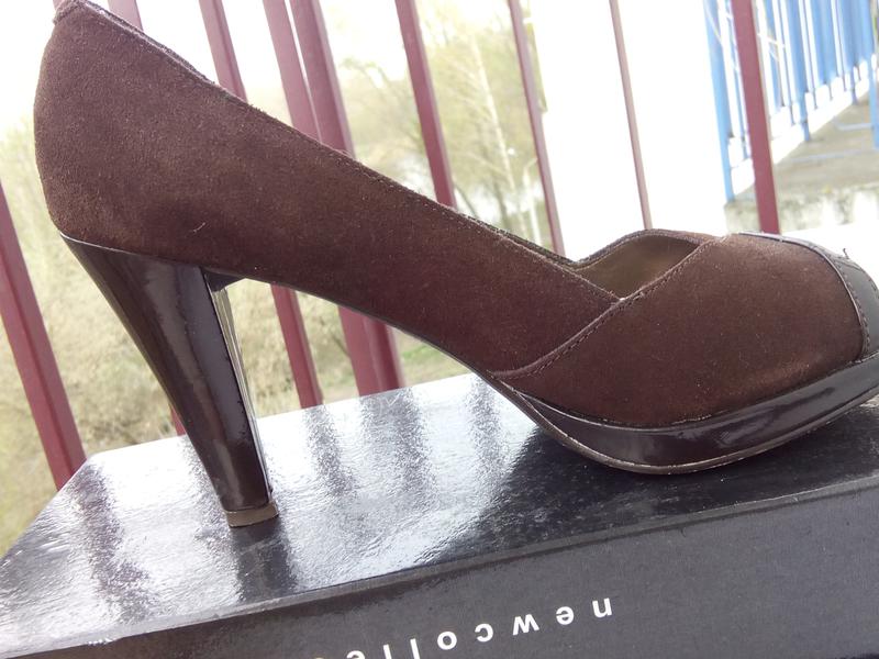 Коричневі туфлі з відкритим носком - натуральна ЗАМША - НОВІ, класика, каблук 9,5 см, платформа 1,5 см, розмір 8 (38-39) устілка 24,5-25 см. дуже зручні для щоденної шкарпетки, всередині також натуральна шкіра.