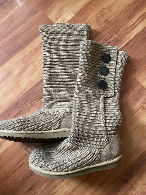 В'язані чоботи UGG. Можна носити як чоботи або як черевики, якщо підвернути. Чобітки В чудовому стані. Матеріал: 50% вовна та 50% акрил, замша на заднику. Всередині на устілці та на заднику — натуральне хутро австралійського мериноса. Розмір 38. За устілкою 24,5 см.