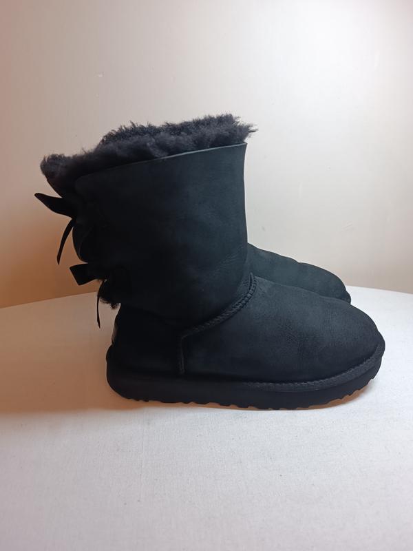 Уггі жіночі UGG Short Bailey Bow Classic 2 Black. Оригінал. відмінний стан. Довжина по устилці 23.5 см. Жіночі Уггі з бантом Короткі Classic ll Bailey Bow Особливістю серії Classic II є особлива просочення замші, яка відштовхує від себе будь-яку рідину і бруд, стійка до забруднень. Склад: -Натуральна замша, попередньо оброблена для захисту взуття від вологи та стійкості до плям. - Вельветова стрічка; -100% натуральна вовна А-класу; -Каучуковая підошва EVA Treadlite від UGGpure; -Устілка з натуральної вовни; Висота: 19 см Колір: чорний