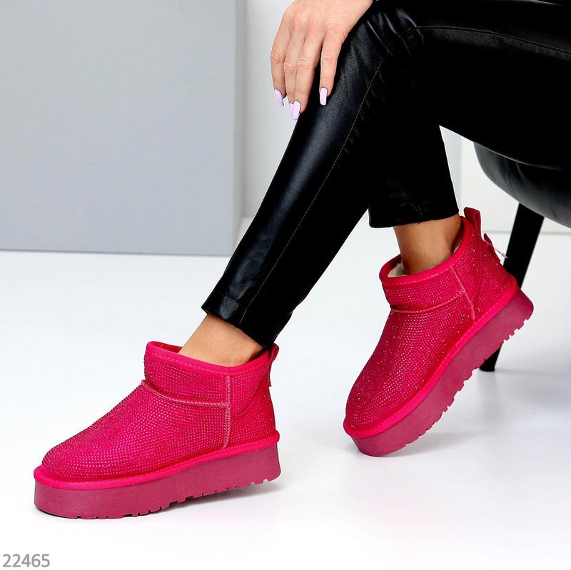 Уггі арт 22465 Розміри: 36-41 Матеріал: натур замша, декорована стразами Всередині: натур хутро набивне Сезон: зима Колір: фуксія Висота від п’ятки: 9см Підошва: 4,5см/3,5см Виробник: фабричний Китай На середню стопу Розмір у розмір 36-23,5 см 37-24 см 38-24,5 см 39-25 см 40-25,5 см 41-26 см 2000грн