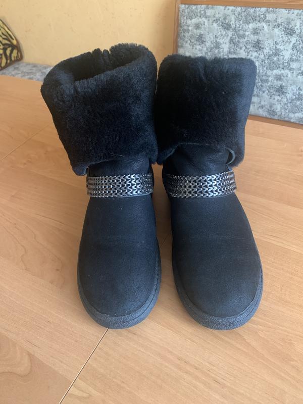 Уги жіночі дуже теплі натуральна замша з фарбуванням усередині натуральне хутро, чорні, підошва не слизька, розмір 38-38,5 підійде на 39! Принт-декор ланцюг товстий, має дуже крутий, зручний комфортний вигляд! Туреччина. Рекомендую!