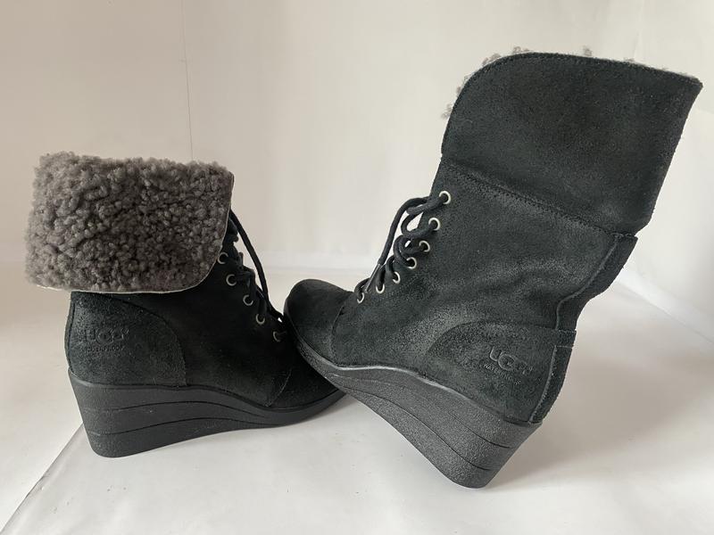 Представлені на фотографіях черевики це UGG Zea Wedge Ankle Boot (чоботи UGG Zea на танкетці). Основні характеристики цієї моделі: Дизайн: Черевики на шнурівці з танкеткою середньої висоти та круглим носком. Матеріали: Водонепроникна замша та підкладка з натуральної овчини (shearling). Особливості: Конструкція з герметичними швами забезпечує сухість та комфорт у холодну та дощову погоду. М'який вовняний відворот можна носити як у піднятому, так і у відвернутому вигляді для створення різних образів. Підошва: Гумова підошва Spider Rubber забезпечує зчеплення з поверхнею. Вказаний розмір 37, 23 см по устілці.