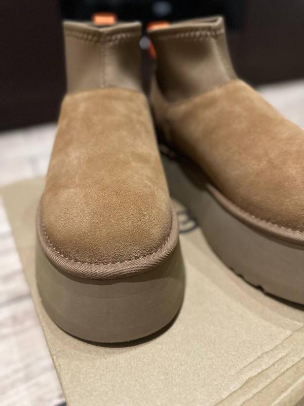 Нові коричневі уггі від ugg classic mini dipper boots. Розмір 37. Уггі UGG – практичне взуття на зиму. Верх виготовлений із замші та неопрену, що поєднує м'якість замші та додаткову водостійкість неопрену, ідеально підходить для зимових умов. Особливості: Високий профіль забезпечує додатковий захист від холоду та снігу. Матеріал підкладки з вовни та текстилю зберігає тепло та забезпечує комфорт під час носіння. Матеріал підошви з EVA забезпечує легкість, амортизацію та комфорт при кожному кроці. Застібка-блискавка і петелька надають зручності та сприяють швидкому вдяганню та зняттю взуття. Взуття розташоване на платформі, що збільшує комфорт та стабільність.
