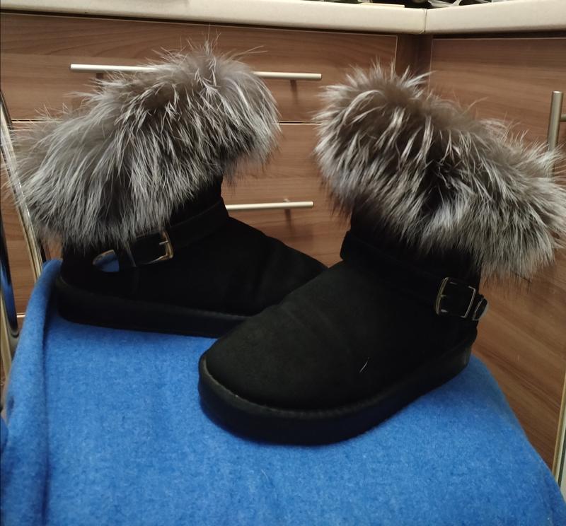 Уггі чорного кольору, натуральний замш з теплющим густим натуральним хутром всередині, товста підошва, оздоблені пряжкою і металевим фірмовим знаком, зверху опушка з хутра чорнобурки. Без нюансів, не затерті, в користуванні майже не були. Дуже гарні і стильні.