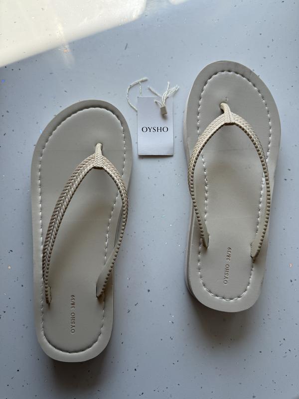 Повністю нові в'єтнамки. Відчеплена етикетка, бо поміряти нормально з нею на пальці неможливо було. Є невелика платформа.