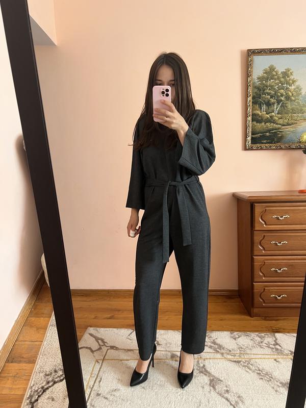 Комбенезон Mango вільного крою темно-сірого кольору в стилі кежуал розмір S,буде і на M.Тканина тоненька,є пояс,ззаду кармани,потаємний замок.Рукави дещо опущені,вільні.Стильна річ ,можна декорувати брошкою.