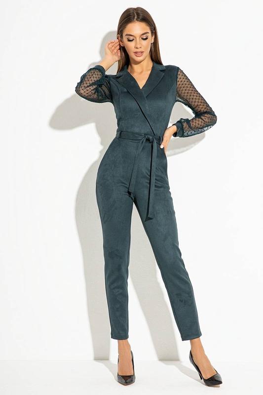 Замшевий комбінезон ромпер пляшкового кольору з рукавами з сітки