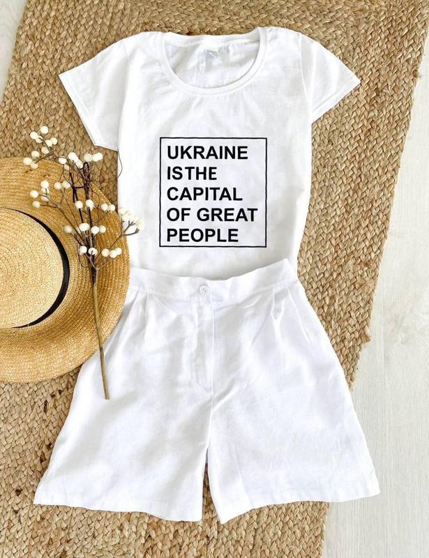 Жіночий комплект, білий, шорти+футболка, з українською символікою