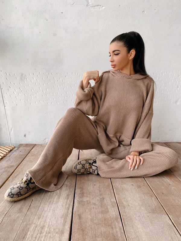 ⛔ крутой вязаный тёплый костюм худи оверсайз и брюки-палаццо длинные ткань нитки шерсть ал...
