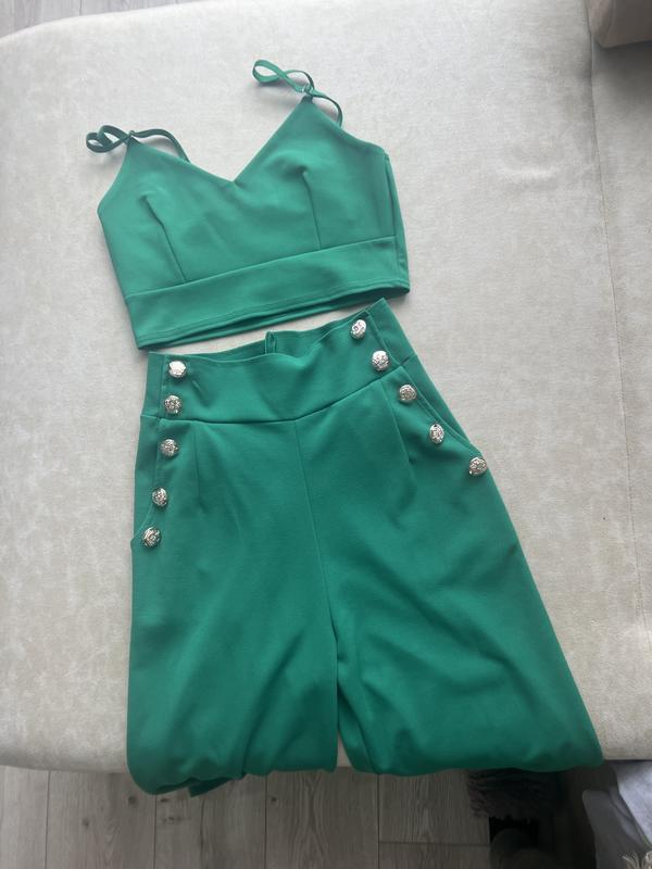 Класний костюм ( топ + брюки з високою посадкою) підійде на ріст 165, фото на мені ( ріст 170 - брюки закороткі ); ярко зелений колір