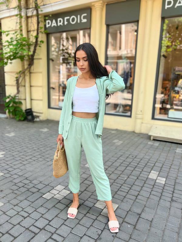 🔥 НОВИНКА 🔥 Костюм Мод. 704 Розміри 42-44, 46-48 Тканина: американський креп-жатка Кольори: білий, гірчиця, олива, блакитний Сорочка вільного крою, застібається на гудзики. Штани на резинці мають робочі кишені. параметри моделі на фото 171см 88-61-92 розмір 42-44
