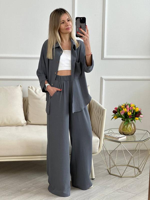 Костюм Тканина: американський жатий креп (тягнеться) Склад тканини: 97% поліестер, 3% еластан Розмір: S, M, L, XL Колір: темно-рожевий, джинс, ківі, мокко, жовтий, персик, молоко, світла оливка, карамель, темна оливка, бежевий, сірий, лазуровий, малина, хакі, електрик, світло-коричневий, блакитний, чорний, червоний, трава