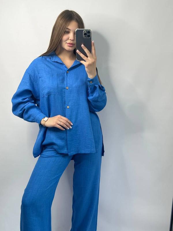 🌸 НОВИНКА 🌸 Лляний костюм-двійка ❤️ Ідеальний комплект для спекотного літа з натуральної тканини льон ☺️ Підходить для вечірньої прогулянки, пляжного відпочинку або походу на роботу 👍 Комплект складається з: ▫️ вільної подовженої сорочки на ґудзиках з боковими нижніми розрізами та накладною кишенею спереді; ▫️ штанів-кльош вільного крою з високою посадкою, широкою резинкою на поясі та зав‘язками. ✔️Кольори : синій, зелений, червоний ✔️Розміри : XS-S, M-L, XL-XXL ✔️Тканина: льон На моделі розмір XS-S Є наложений платіж по передоплаті