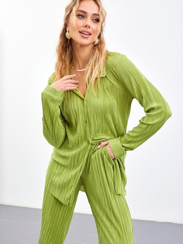 Брючний плісирований костюм із сорочкою. Верх вільного крою зі спущеною лінією плечового цва та відкладеним коміром. Застібається на ґудзики. Штани рямого крою з кишенями з боків. Пояс на резинці.