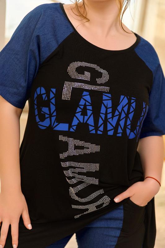 Костюм ассиметрия туника свободная вырез овальный рукав реглан вставка аппликация стразы б...