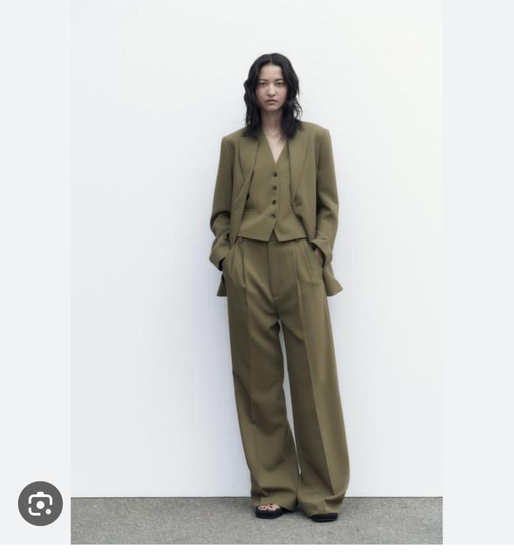 ZARA брючний жіночий костюм, колір - оливка притуплений. Вживу відтінок ще гарніший. Оригінальний колір ЗАРИ. Розмір М, хоча і на оверсайз S може піти піджак. Всі бірки на місці. Країна - Іспанія. Брала швидко на розпродажі. Але потім побачила, що не мій розмір. Довжина брюк - 116 см, решта параметрів на фото.