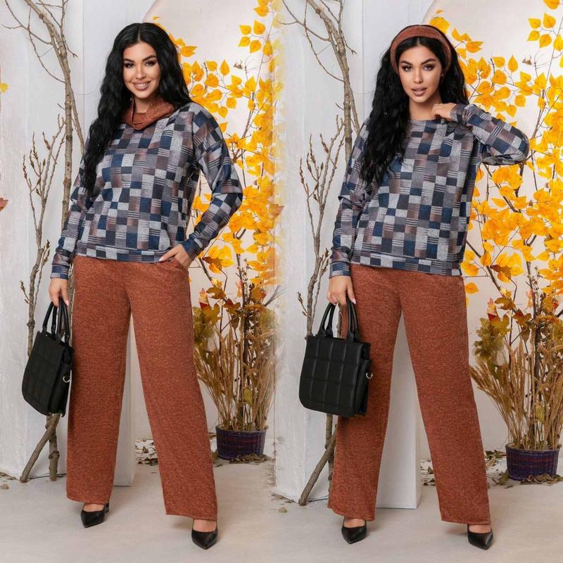 Новинка Костюм двійка Модель № 7403-1 Розмір : 46-48; 50-52; 54-56; 58-60 Тканина : трикотаж ангора - софт ГАРНА РОЗТЯЖНІСТЬ Довжина кофти : 68 см.. Довжина рукава : 79 см. ( від горловини ) Довжина штанів : 105 см. (пояс на гумці ) Практичний костюм , штани прямого покрою , з бічними кишенями , пояс на гумці . Кофта прямого покрою на манжеті . Комір знімний . Тканина гарної якості , зносостійка , не леняє , не кашлатиться , приємна на дотик . 700.00 грн