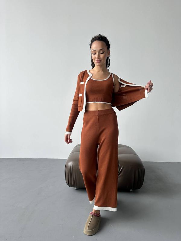 Новинка Трикотажний костюм трійка ( топ , Кардиган і штани ) 4 забарвлення : чорний , коричнево- рудий , блакитний , мокко ) Розмір універсальний 42/46