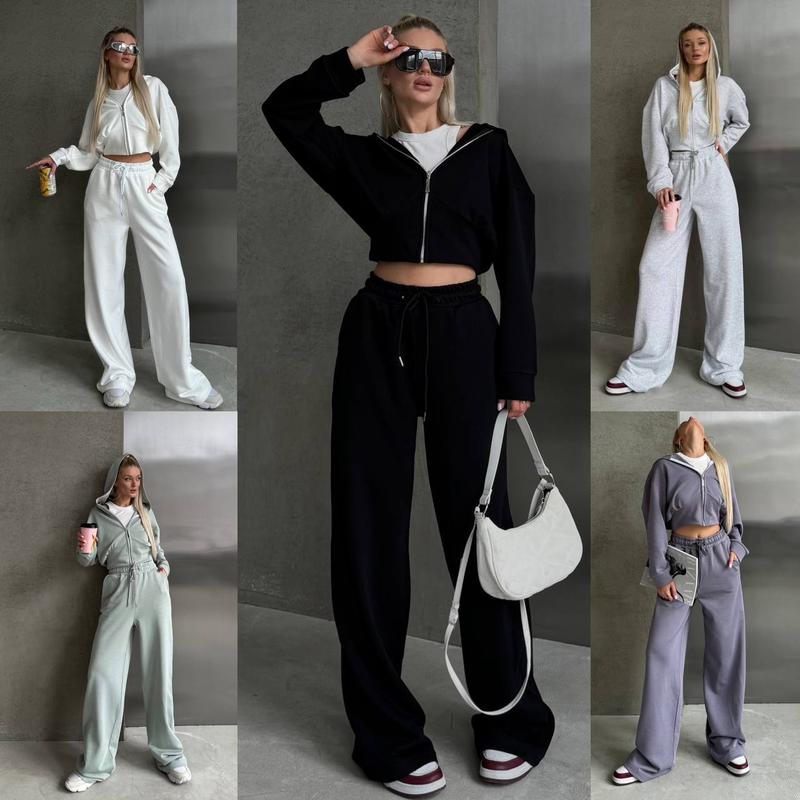 Модель 5507 Жіночий костюм Дуже стильний у цьому сезоні костюм (скорочений світшот на блискавці та широкі брюки) Розмірний ряд S,M,L,XL Тканина якісний турецький футер петля! Кольори графіт, білий, світло-сірий, фісташка та чорний Кофта на блискавці з капюшоном Брюки на резинці,по бокам кишені, зі шнурками Ціна 1150 грн кетрін