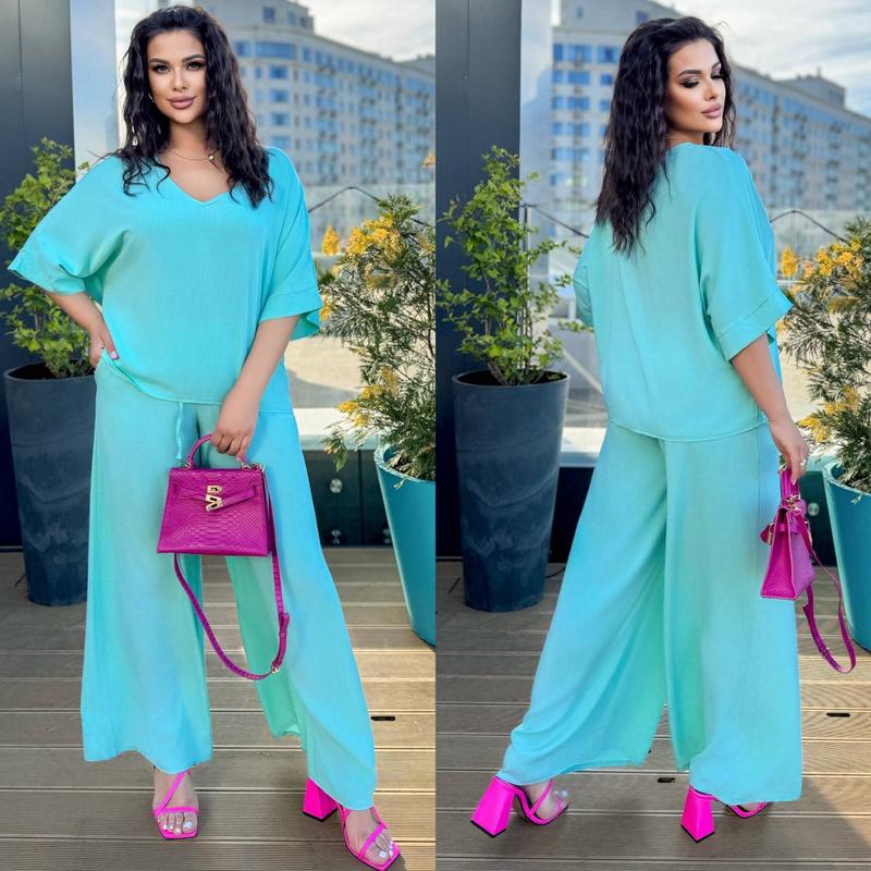 Жіночий літній лляний брючний костюм футболка і широкі штани брюки оверсайз льон літо