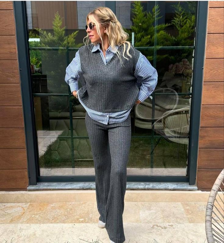 ❄️𝓝𝓮𝔀 𝓬𝓸𝓵𝓵𝓮𝓬𝓽𝓲𝓸𝓷 ❄️ ⚪️⚫️⚪️⚫️⚫️⚪️⚫️⚫️⚫️ ⚫️⚫️⚫️⚫️⚫️⚪️⚫️⚪️⚪️ ■ Трикотажний костюм у поєднанні з сорочкою обманкою ■ Модель : 0452 ■ Ціна: 1149 грн ■ Тканина : Турецька ангора рубчік / коттон ■ Розміри: 42-44, 46-48,50-52 ■ Опис: На зображенні представлений костюм із Турецької ангори рубчик у поєднанні з сорочковою тканиною, що складається з трикотажного верху та штанів. Тканина жилета та штанів має текстуру рубчика, що надає образу елегантної фактури та м'якості, плюс поєднується з класичною сорочкою обманкою в чорну смужку, яка додає контраст і освіжає вбрання. Сорочка обманка випущена з-під жилета, що створює розслаблений, але стильний і сучасний образ. Ангора рубчик - цей матеріал виготовляється з натуральної сировини, а саме з вовни.