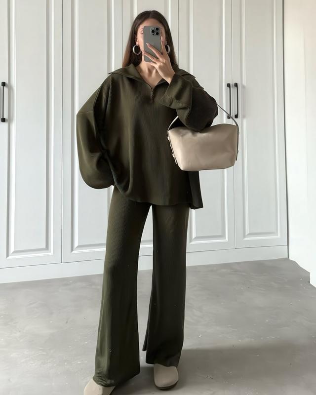 Мод.659 Тканина: рубчік віскозний на флісі Колір: чорний, бежевий, синій, хакі, шоколад Розмір: 42-44, 44-46 Костюм у рубчик - це теплий та зручний повсякденний образ. Кофта з коміром на блискавці, штани на високій посадці. Готовий look на будь-який випадок. Заміри: - Кофта ОГ 128 см Довжина рукава від шиї 79 см Довжина по спинці 60 см - Штани ОТ 62-72/66-76 см ОБ 96-100/100-106 см Довжина по боку 104 см Довжина шаг/шва 75 см