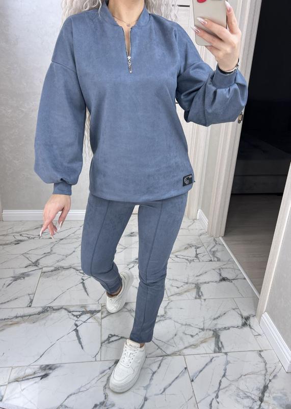 Жіночий брючний костюм двійка світло синій замшовий кофта на блискавці з об'ємними рукавам...