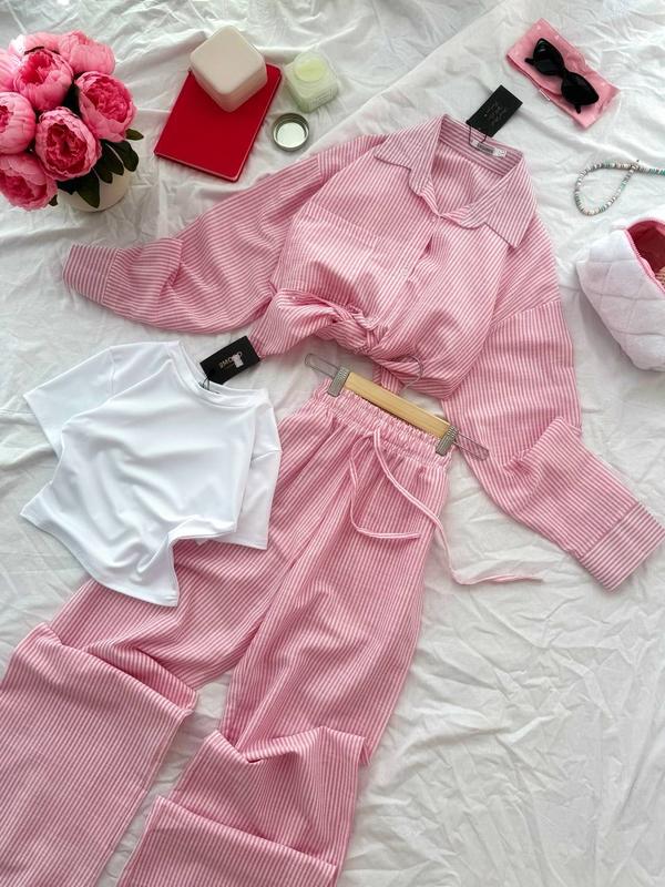 New🩶 2MOOD Костюм трійка Реальні фото🔴 🔘Мод 1132 🔘Розміри - 42-44, 46-48 🔘Кольори - блакитний, рожевий 🔘Тканина - льон смужка + мікродайвінг 🔘Ціна 3-ка(з топом): 1045 грн Практичний легкий Костюм з натуральної тканини. В вільному фасоні. Тренд на літо - костюм в смужку. Тканина не світиться, та не мнеться. Сорочка на ґудзиках, штанці на резинці та шнурком. В комплекті може йти топ. Тканина добре тягнеться та сідає по фігурі.