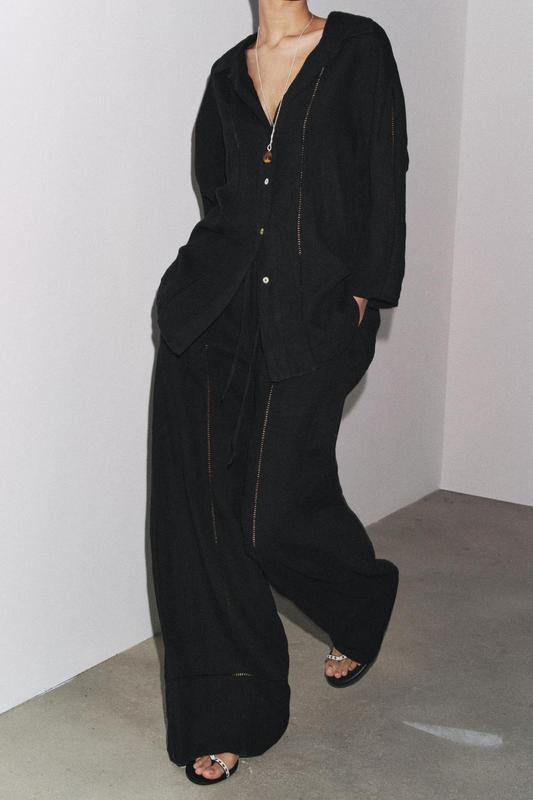 КОСТЮМ ЗІ 100%-ГО ЛЬОНУ В наявності розміри XS, S, M, L Стан новий з паперовими бірками 🇪🇺 з Широкі штани зі 100%-го штапельного льону з еластичним поясом, прорізними кишенями по боках, мереживом у тон та широкими штанинами. Сорочка зі 100%-го штапельного льону з V-подібним вирізом, рукавами нижче ліктя, мереживними обробками, асиметричним низом і застібкою на ґудзики спереду. 💫Заміри: 👔-Сорочка: ✨Розмір XS: довжина 71 см. плечі 55 см. рукав 40 см./від горловини 62 см., ширина рукава в районі біцепса 20 см., півобхват грудей 65 см., півобхват талії 65 см , півобхват стегон 65 см. ✨Розмір S: довжина 72 см. плечі 57 см. рукав 38 см./від горловини 59 см., ширина рукава в районі біцепса 22 см., півобхват грудей 68 см., півобхват талії 68 см , півобхват стегон 68 см. ✨Розмір M: довжина 74 см. плечі 60 см. рукав 39 см./від горловини 60 см., ширина рукава в районі біцепса 23 см., півобхват грудей 70 см., півобхват талії 70 см , півобхват стегон 70 см. ✨Розмір L: довжина 75 см. плечі 62 см. рукав 40 см./від горловини 63 см., ширина рукава в районі біцепса 24 см., півобхват грудей 74 см., півобхват талії 74 см , півобхват стегон 74 см. 👖-штани:: ✨ Розмір XS: довжина 109 см., внутрішній шов 80 см., ПОТ 30-35 см., ПОС 50 см., посадка 30 см., ширина штанини 33/36 см. ✨ Розмір S: довжина 110 см., внутрішній шов 81 см., ПОТ 33-38 см., ПОС 52 см., посадка 31 см., ширина штанини 35/37 см. ✨ Розмір M: довжина 107 см., внутрішній шов 77 см., ПОТ 34-40 см., ПОС 53 см., посадка 32 см., ширина штанини 35/36 см. ✨ Розмір L: довжина 107 см., внутрішній шов 78 см., ПОТ 38-44 см., ПОС 57 см., посадка 33 см., ширина штанини 36/36 см. ✨ Розмір XL: довжина 109 см., внутрішній шов 79 см., ПОТ 40-46 см., ПОС 57 см., посадка 33 см., ширина штанини 36/36 см.