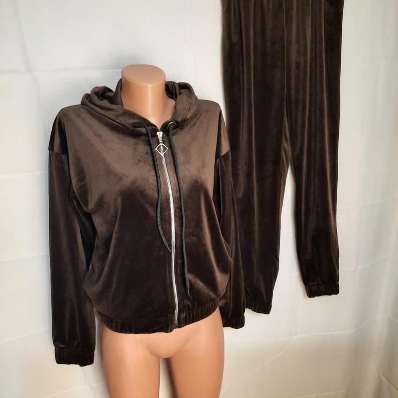 Велюровий костюм. Новий, з біркою. По бірці розмір 42, підійде і на 46. Колір шоколаду. Штани, довжина 97 см, Пот 29 см, Пос 44 см, внутрішній шов 72 см. Кофта, довжина 53 см, Пог 46 см, Пот 44 см, рукав від горловини 67 см. Має кармани. УП, НП.