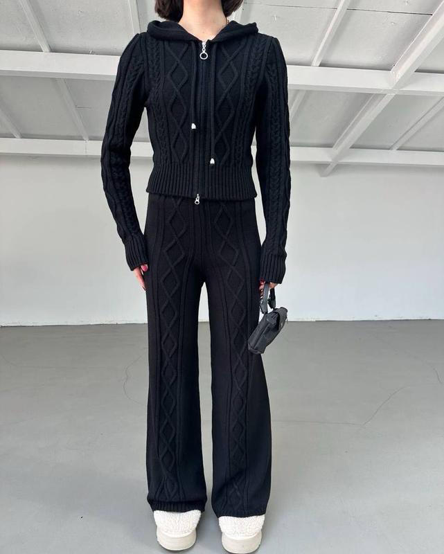 Костюм Хлоя Стильний в’язаний комплект зі щільної машинної в’язки. Матеріал приємний до тіла, гарно тримає форму та виглядає дорого М’яка фактурна в’язка дарує тепло та комфорт у прохолодну погоду, а візерунок додає елегантності образу. Розмір єдиний 42-46 Дрібна машинна вʼязка Склад: 70% бавовна, 30% акрил Кольори: чорний та шоколад Виробництво Туреччина 🇹🇷 Всі фото та відео реальні Кофта: 🔹Довжина по спинці 45 см 🔹Обʼєм по грудях від 80 до 100 см 🔹Довжина рукава 70 см Штани: 🔹Довжина по зовнішньому шву 108 см 🔹Довжина по внутрішньому шву 76 см 🔹Обʼєм по талії від 55 см до 90 см 🔹Обʼєм по стегнам від 85 см до 105 см